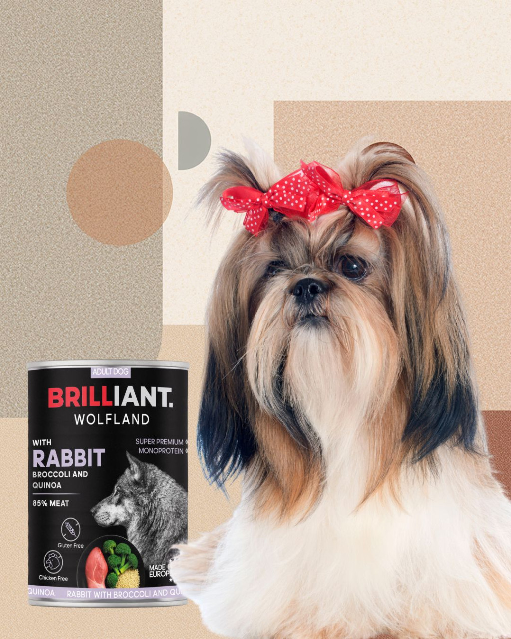 Nyúlhús 85%, brokkoli, quinoa 5%, lazacolaj, vitaminok és ásványi anyagok, gyógynövények.